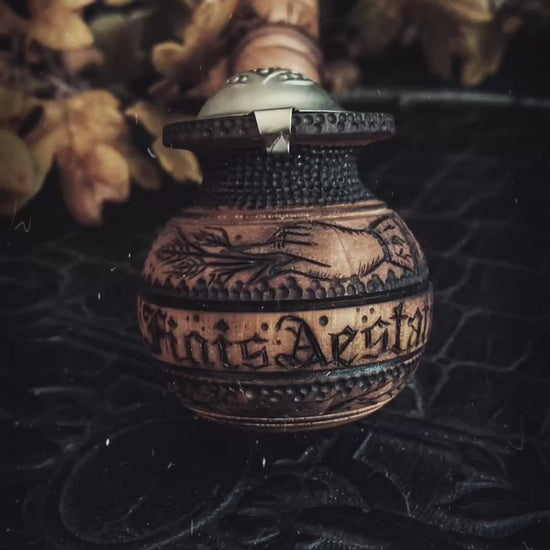 On the edge of Samhain, when the air tastes of woodsmoke and the last leaves sigh their descent, when the veils grow thin and the air smells of spice and endings… a cherrywood pipe sits aglow in the firelight. Across its surface, my hand has burned a story into being. Finis Aestātus… the end of summer… unfolds in a medieval script, marking the passage of warmth into the hush of autumn. A Victorian hand offers a sheaf of wheat, an old-world gesture to the spirits of harvest and memory, to whatever souls still wander the fields. Around the stem, an Ouroboros coils in eternal circle, whispering of life unending, of the dance between decay and becoming.