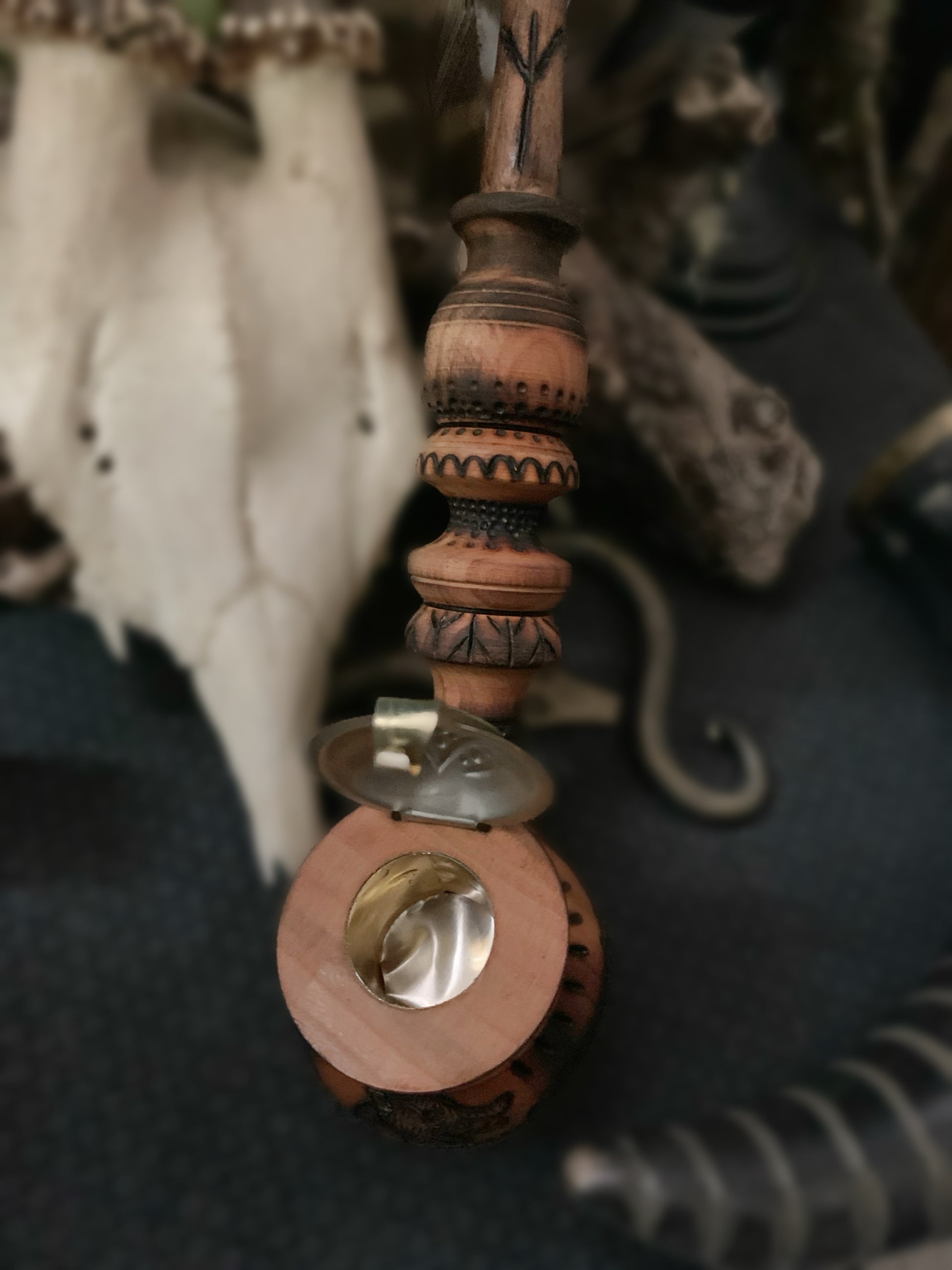 A cherrywood ritual pipe, sourced from skilled hands in Ukraine and crafted for gentle, reverent use. Upon the bowl, a Viking Age dragon stirs from the wood itself, its form drawn from an ancient artifact (see pictures), its scowl fierce and timeless. The pipe is also adorned with the Algiz rune and a Sunwheel, as protection and the endless turning of the seasons. To hold this pipe is to summon the old stories, to feel the slow pulse of the hearth, and to walk for a moment with the ancestors who linger at the edge of flame and shadow.